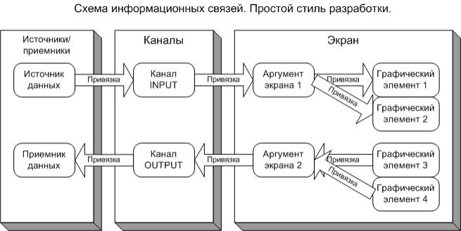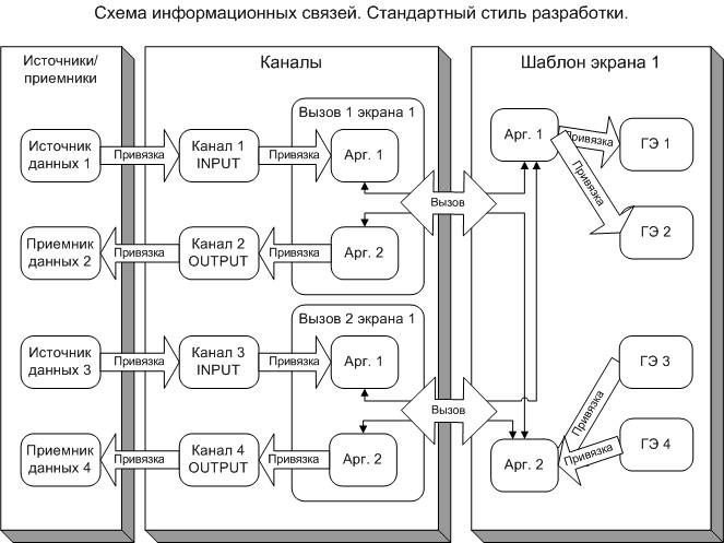 Размещая на экране графические элементы (ГЭ) , пользователь сразу получает возможность осуществить их динамизацию и привязку к аргументам экрана. Аргументы же, в свою очередь, привязываются к каналам, а каналы связываются с источниками и приемниками данных.