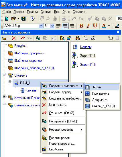 При выборе простого стиля в дереве проекта автоматически создается один узел рабочей станции (RTM_1) и главный экран (Экран#1), после чего можно сразу приступать к разработке мнемосхемы технологического процесса. Новые экраны, каналы, источники данных, программы и прочие компоненты добавляются в том же дереве проекта с помощью несложных манипуляций мышью.