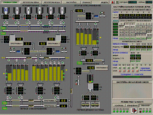 Состав структур показывает, что основные функции автоматического управления технологическими режимами сосредоточены в системе зерноочистительного отделения, а в размольном преобладают информационно-учетные функции. Такое распределение отражает главную цель автоматизации мукомольной технологии в целом: в зерноочистительном отделении – устранить человека, как фактор, раскачивающий процесс, и стабилизировать характеристики сырья, в размольном – повысить объем, достоверность и скорость циркуляции информации в человеко-машинном контуре эвристического управления процессом. На рис. 9 и 10 приведены главные операторские экраны рабочих станций.