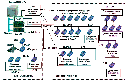 Система реализует заданный режим путем прямого цифрового регулирования 12 расходов зерна из емкостей и дискретного регулирования уровней в группах емкостей по сигналам датчиков уровня, на которых оператор устанавливает маркер. В случае аварий транспортного оборудования предусмотрена автоматическая блокировка потоков с последующим восстановлением заданного режима. Программную реализацию функций контроля, управления и регулирования обеспечивает центральный компьютер. Обмен информацией с преобразователями расхода, дискретными датчиками и исполнительными механизмами осуществляется системой интеллектуальных модулей серии I – 7000 (рис. 5). Для повышения живучести системы и увеличения скорости обмена модули сгруппированы по функциональному признаку в три сети RS-485, работающие через два двухпортовых адаптера – преобразователя интерфейсов. Длина сетей до 100 м, скорость связи – 57600 кБод
