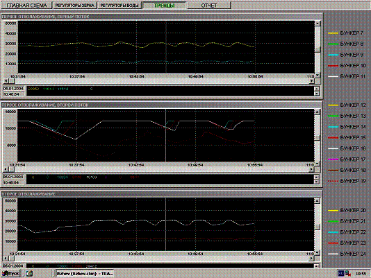 автоматическую обработку, учет и интегрированное представление технологу в реальном времени информации с трех электронных весов готовой продукции по системе план/факт, в том числе – выработки, производительности и выходов готовой продукции по сортам, а также оперативного комплексного критерия технико-экономической эффективности, в графической и численной форме,